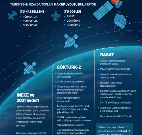 Turkey, which has intensified its efforts in the field of space technologies, has a total of six active satellites. Three of them are communication satellites and the other three are earth observation satellites. While Türksat 3A, Türksat 4A and Türksat 4B satellites meet communication needs, Rasat, Göktürk-1 and Göktürk-2 satellites are used for observation purposes.