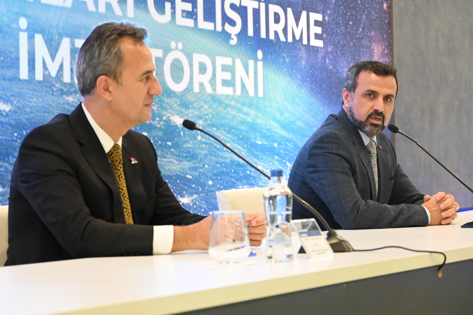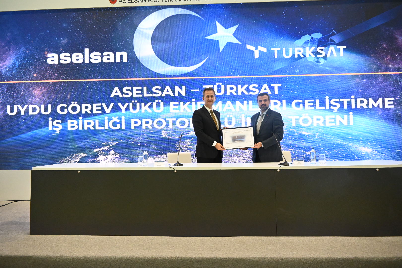 After the protocol signing ceremony, ASELSAN Chairman and General Manager Prof. Dr. Görgün presented a model of domestic and national Ku Band Receiver and Ka band LNA equipment to TÜRKSAT General Manager Ertok, on the other hand Türksat General Manager Ertok presented a Türksat 5B model to ASELSAN Chairman and General Manager Prof. Dr.  Görgün.