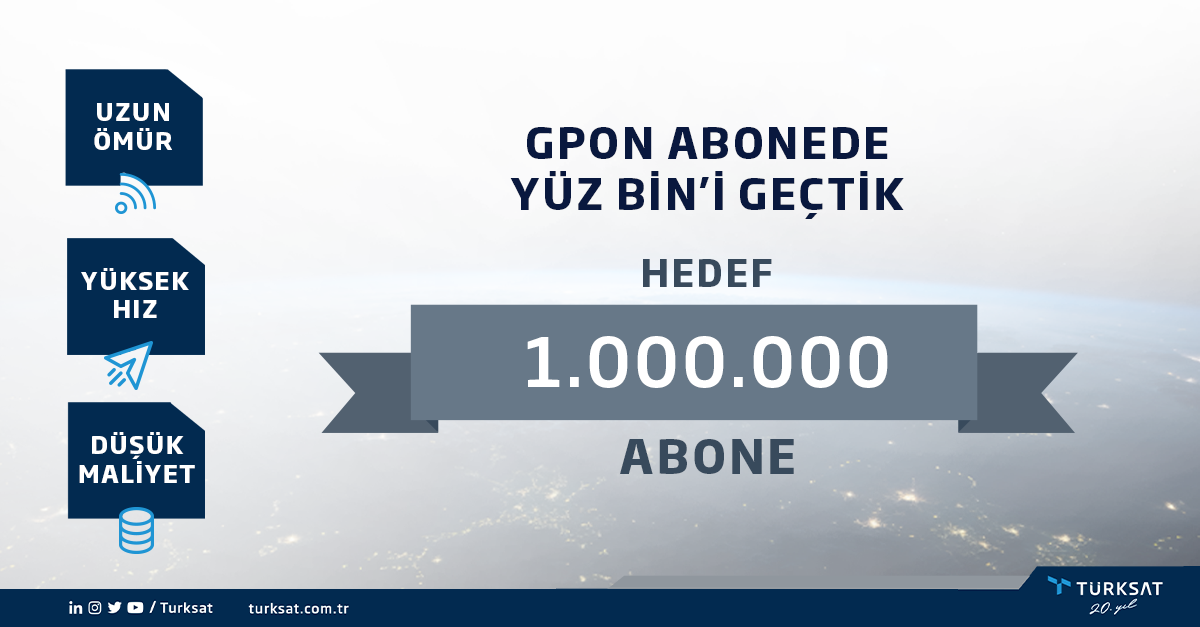 Türksat tarafından yüksek hız, düşük maliyet ve uzun ömürlülük avantajlarıyla sunulan Gigabit Passive Optical Network (GPON) hizmetinde abone sayısı, Nisan 2024 itibarıyla 100 bini geçti. Türksat Genel Müdürü Hasan Hüseyin Ertok, hedefin bir milyon aboneye ulaşmak olduğunu söyledi.