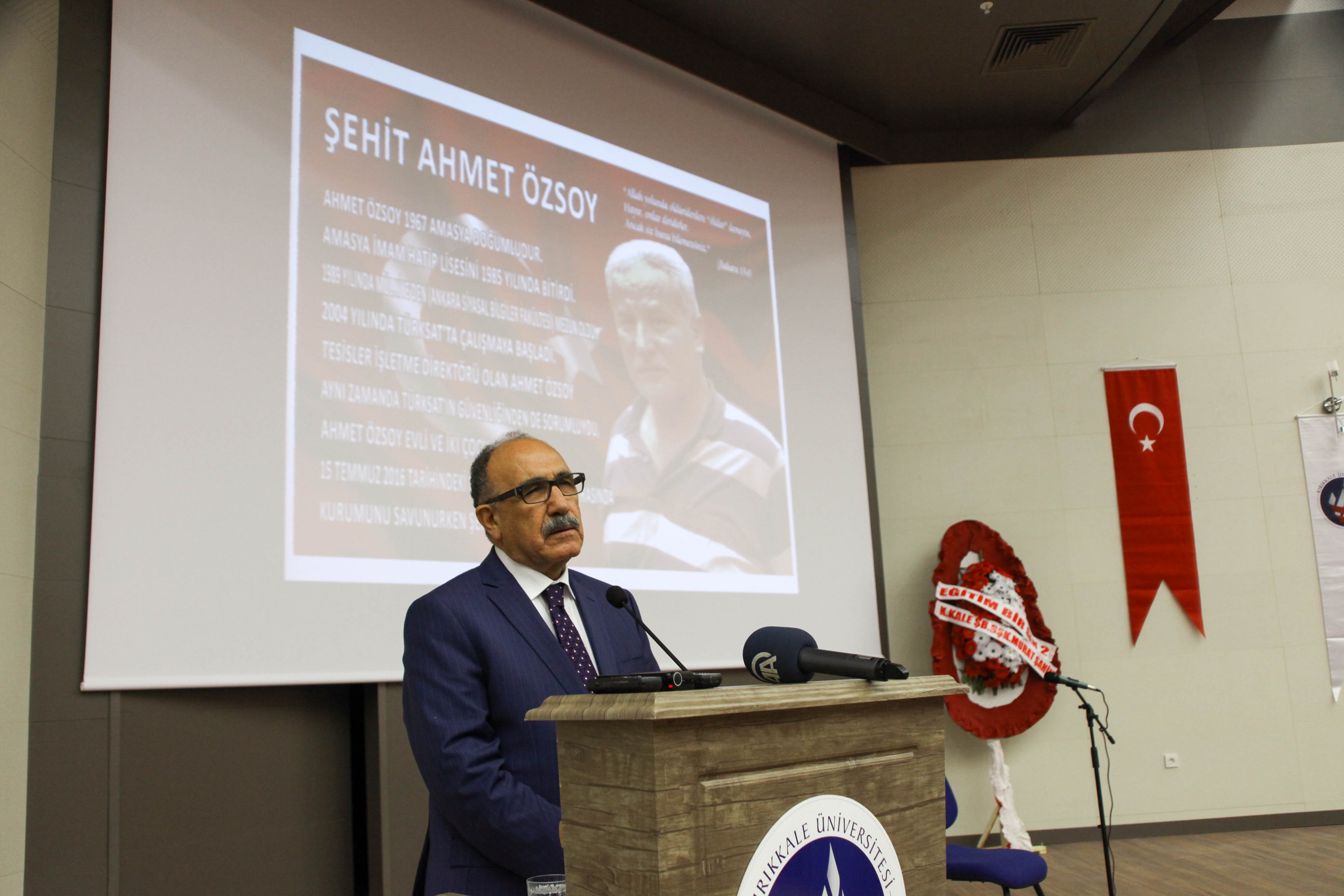 “İçimiz yansa da bu topraklar 240 şehidin taze kanıyla yeniden sulanmıştır. Bu menfur girişimde de Kırıkkale’nin şehitleri olmuştur. KÜ’nün de iki şehidi olmuştur. Birincisi Mühendislik Fakültesi mezunumuz Aydın Çopur, diğeri ise açılışını yaptığımız ve adını verdiğimiz Özsoy kardeşimizdir. Özsoy kardeşimiz, KÜ’nün ilk dönem asistanlarındandı. Allah rahmet eylesin. Mekânı cennet olsun.”