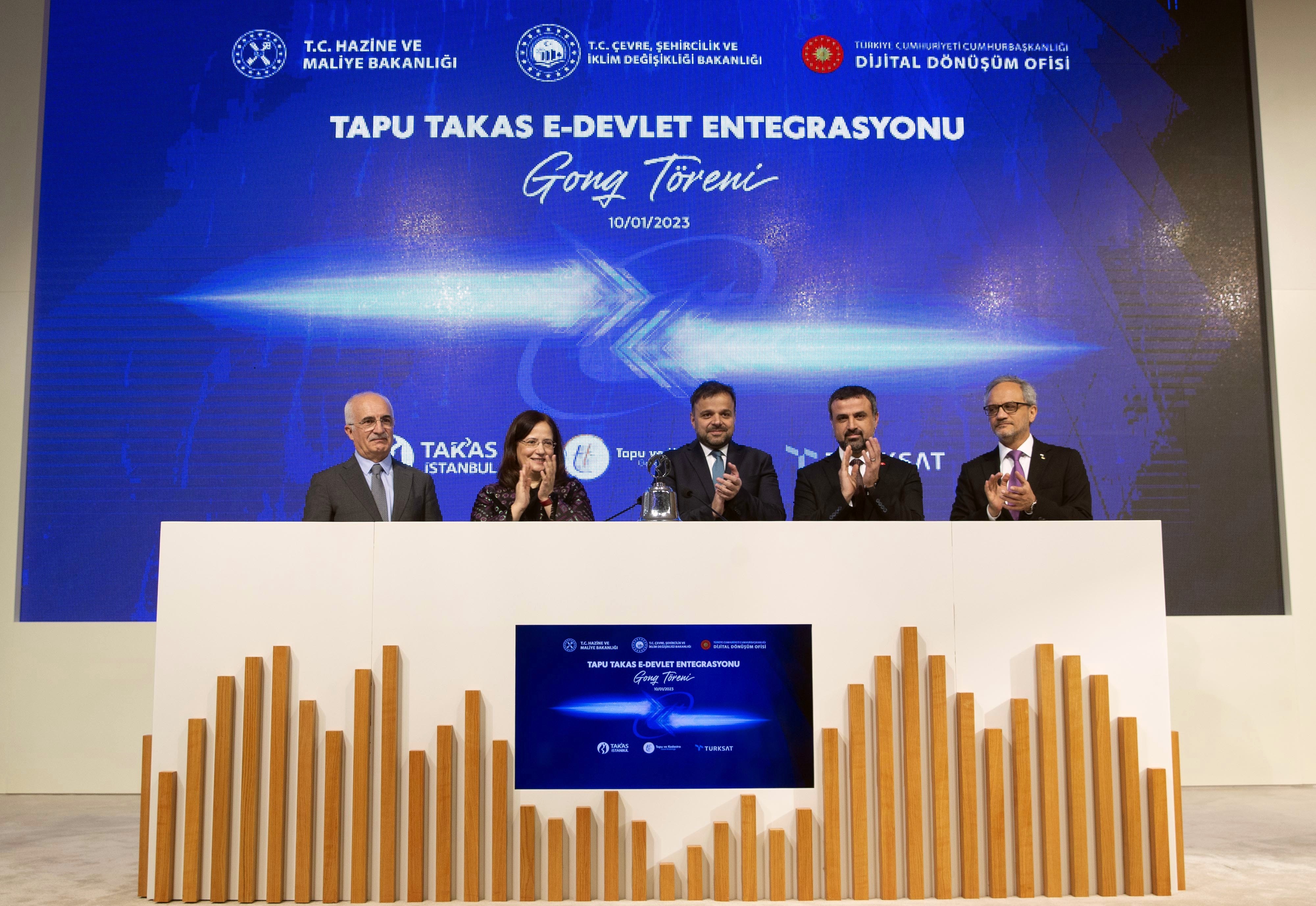 Tapu Takas e-Devlet Entegrasyonu Gonk Töreni, Cumhurbaşkanlığı Dijital Dönüşüm Ofisi Başkanı ve Türksat Yönetim Kurulu Başkan Vekili Dr. Ali Taha Koç, Çevre, Şehircilik ve İklim Değişikliği Bakan Yardımcısı Fatma Varank, Türksat Genel Müdürü Hasan Hüseyin Ertok, Takasbank Genel Müdürü Avşar R. Sungurlu ile Tapu ve Kadastro Genel Müdürü Mehmet Zeki Adlı tarafından Borsa İstanbul’da gerçekleştirildi.