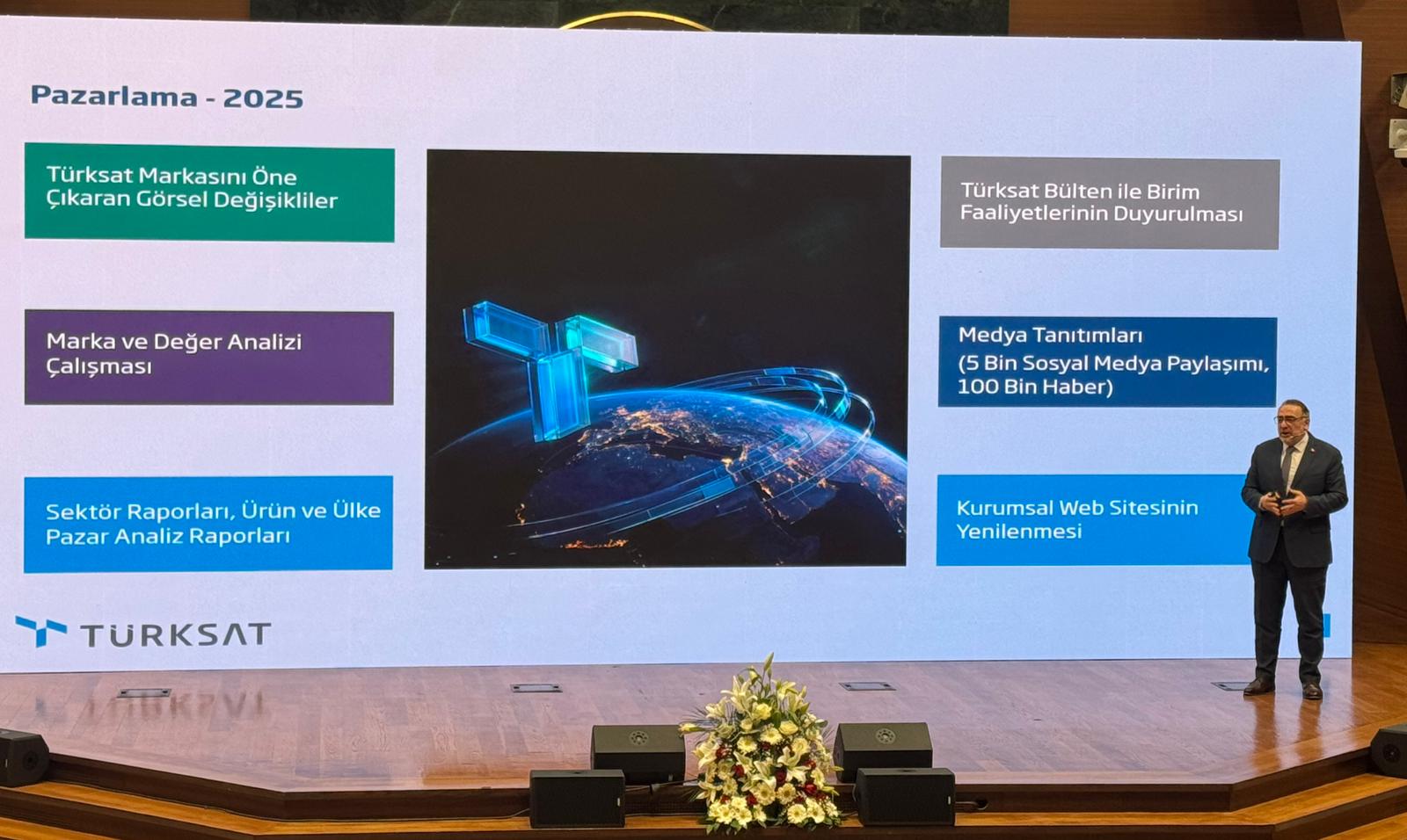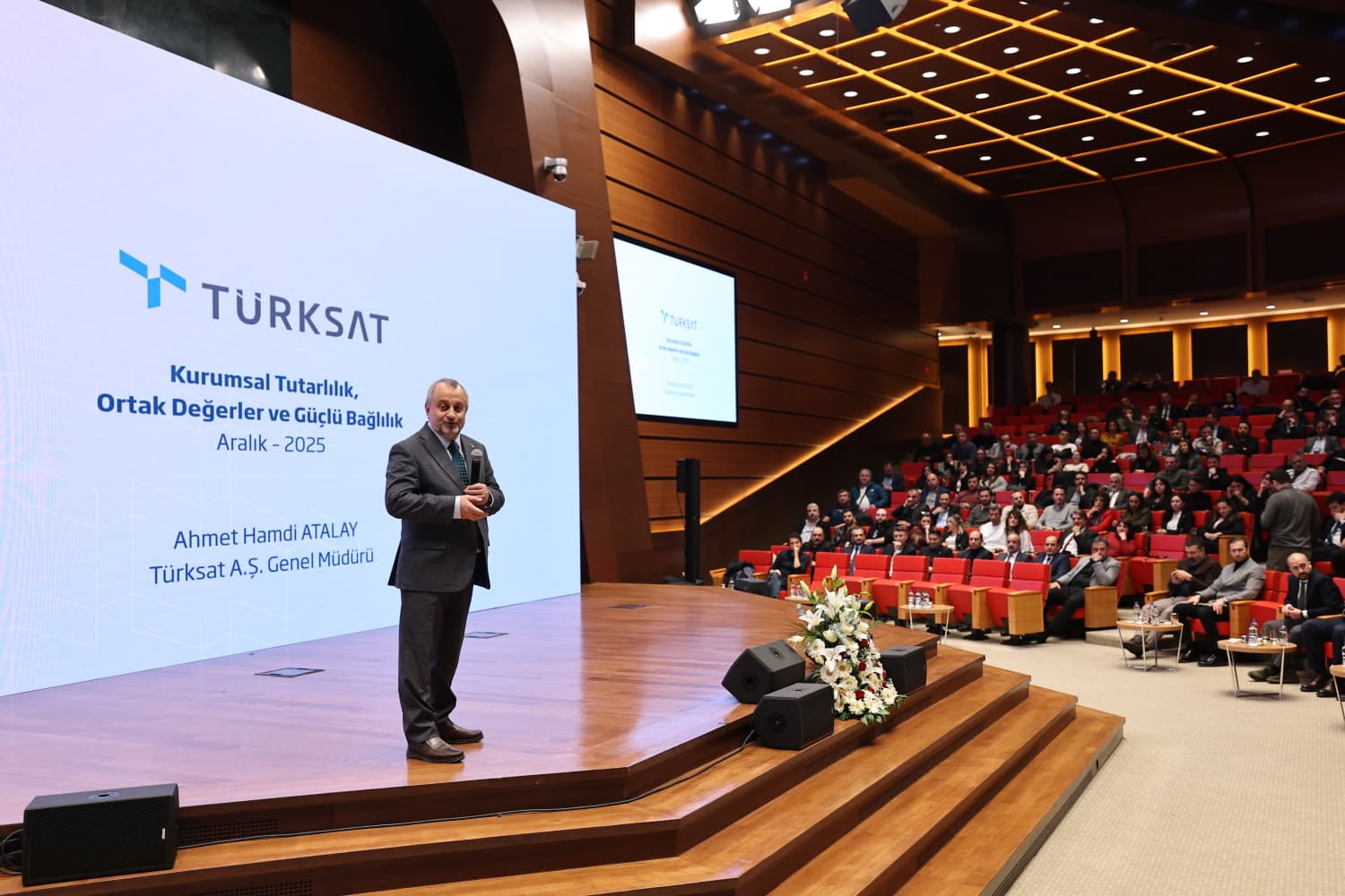 Türksat Genel Müdürü Ahmet Hamdi Atalay, açılış konuşmalarının arından yaptığı sunumda kurumun dağınık organizasyon yapısı nedeniyle büyük gruplarla sık buluşamadıklarını belirterek, “Gölbaşı tesislerimizde bir konferans salonu yapmak da projelerimiz arasında. Bunu gerçekleştirdiğimizde bütün çalışanlarımızla daha sık bir araya gelmeyi hedefliyoruz.” dedi. Yönetim anlayışlarını “önceliği net, odağı belirli ve katılımcı” olarak tanımlayan Atalay, “Her işi yapan değil; belirlediğimiz, odaklandığımız işleri yapan bir organizasyon olmayı hedefliyoruz.” dedi. Türksat 6A’nın 2025 Nisan ayında hizmete alındığını hatırlatan Atalay, “O günden bugüne çok şükür sorunsuz bir şekilde faaliyetini yürütüyor.” ifadelerini kullandı. 6A ile ihracatın gerçekleştiğini belirten Atalay, “6A üzerinden yaptığımız ticari faaliyet, bize ilham oldu.” dedi.