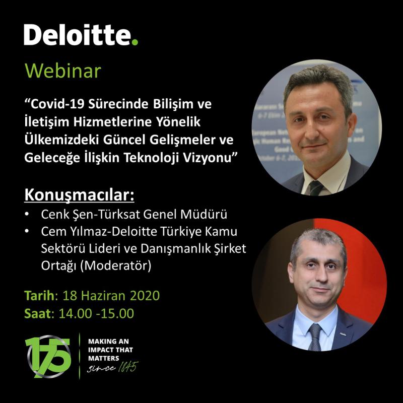 COVID-19 sürecinde bilişim ve iletişim hizmetlerine yönelik olarak Türkiye’deki güncel gelişmelerin ve geleceğe ilişkin teknoloji vizyonunun değerlendirildiği Deloitte Webinarı, 18 Haziran 2020 tarihinde Türksat iletişim desteğinde gerçekleştirildi.