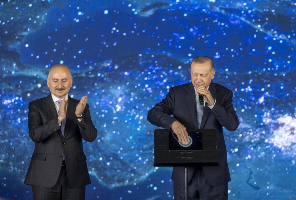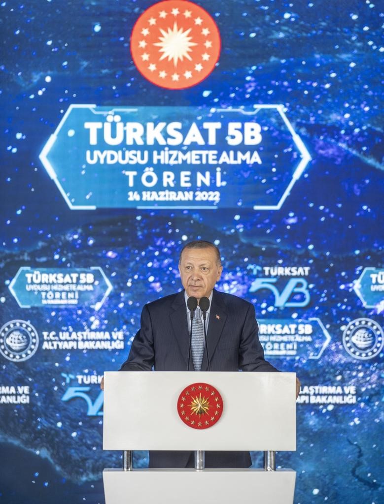 "Bugün hizmete alacağımız Türksat 5B'nin uzay yolculuğu 19 Aralık 2021'de başladı. Türk mühendisleri tarafından geliştirilen yerli ve milli gözetleme uydumuz İMECE'yi 2023'ün Ocak ayında, Türksat 6A'yı da yine 2023 yılı ortalarında uzaya fırlatıyoruz. Böylece, uzaydaki uydu sayımız, 10'a yükselecek. Başlattığımız Milli Uzay Programı ile ülkemizin tıpkı yer yüzündeki kara, deniz ve hava sahalarındaki menfaatleri gibi uzaydaki çıkarlarını da savunmak bizim namus borcumuzdur. Kendi uydularımızı geliştirmekten ay yüzeyine araç göndermeye, uluslararası uzay programlarına bilim insanı yetiştirmeden uzay sanayine kadar her alanda ülkemizi hak ettiği seviyeye getirecek adımları atıyoruz."