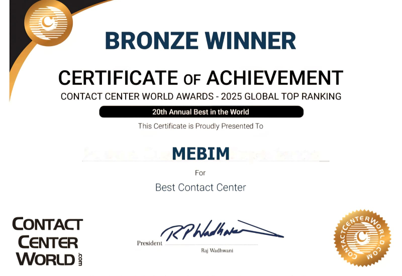 Çağrı merkezi sektöründe küresel ölçekte en başarılı uygulamaların değerlendirildiği ve sektörün en prestijli uluslararası organizasyonlarından Contact Center World finalleri, bu yıl 27–31 Ekim 2025 tarihlerinde Yunanistan’ın Loutraki şehrinde gerçekleştirildi. Organizasyona 32 ülkeden 49 kurum katıldı. Millî Eğitim Bakanlığı ile Türksat A.Ş. iş birliğiyle kurulan Millî Eğitim Bakanlığı İletişim Merkezi (MEBİM), Contact Center World Global Finali 2025’te önemli bir başarıya imza attı. MEBİM, “En İyi İletişim Merkezi” kategorisinde dünya üçüncülüğü elde ederek, Bronz Madalya ödülüne layık görüldü.