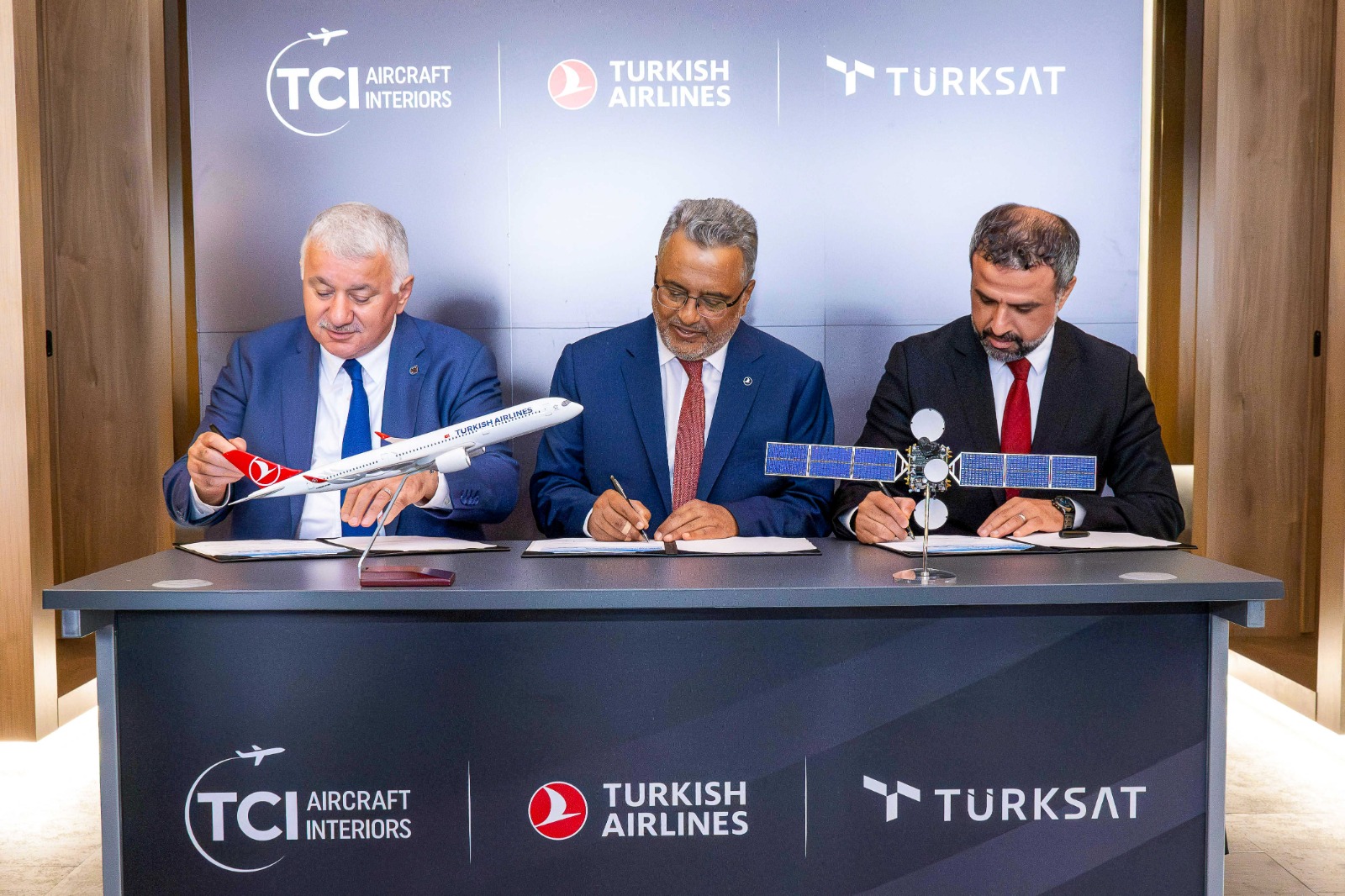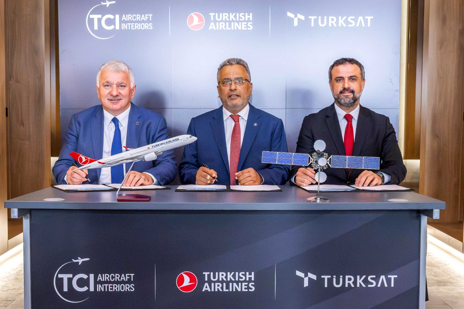 Türk Hava Yolları (THY) uçuşlarına sınırsız, kesintisiz ve daha hızlı internet bağlantısı sağlayacak stratejik iş birliği anlaşması; Türksat Genel Müdürü Hasan Hüseyin Ertok, THY Yönetim Kurulu Başkanı Ahmet Bolat, THY Genel Müdürü Bilal Ekşi tarafından imzalandı.